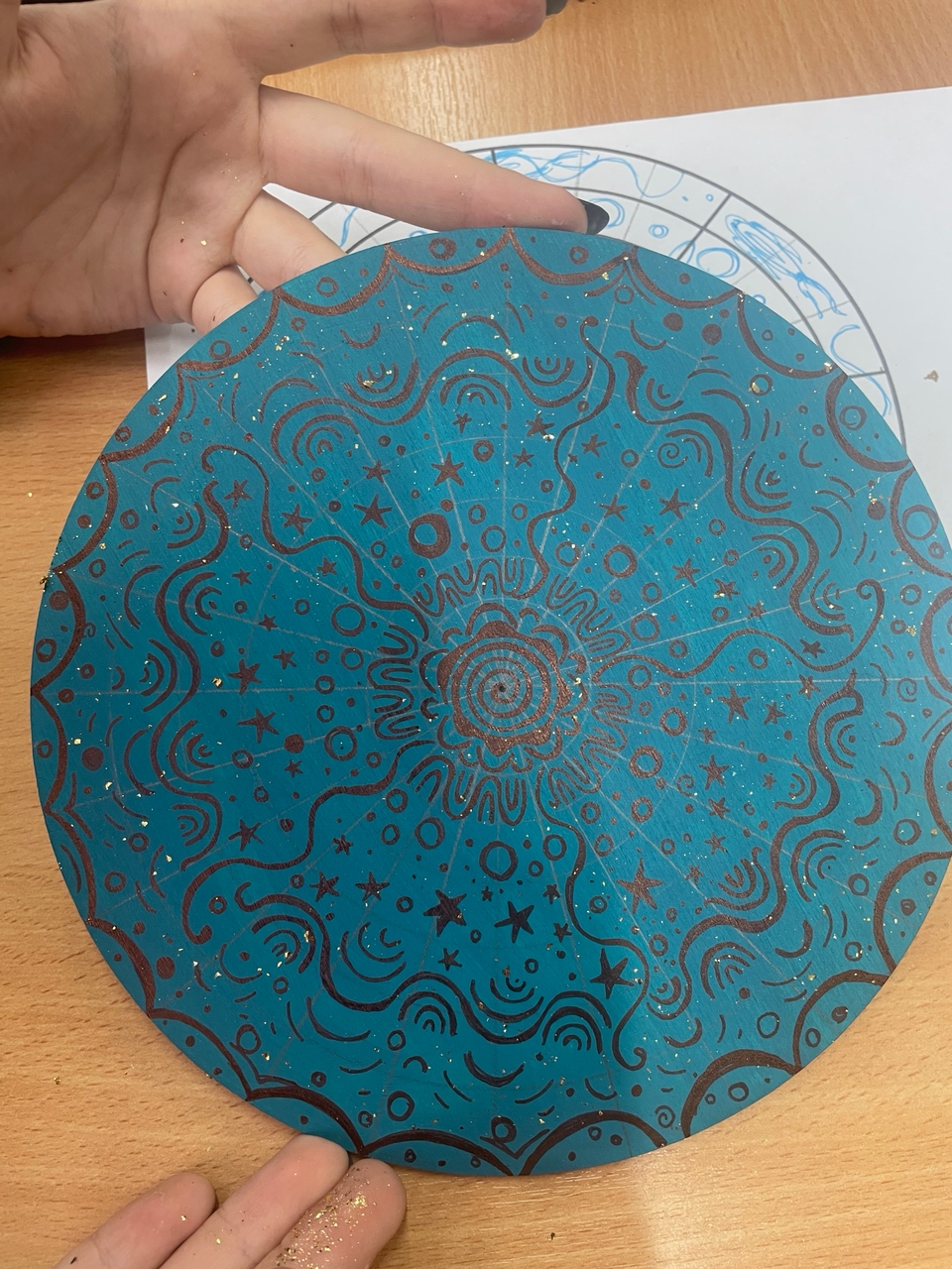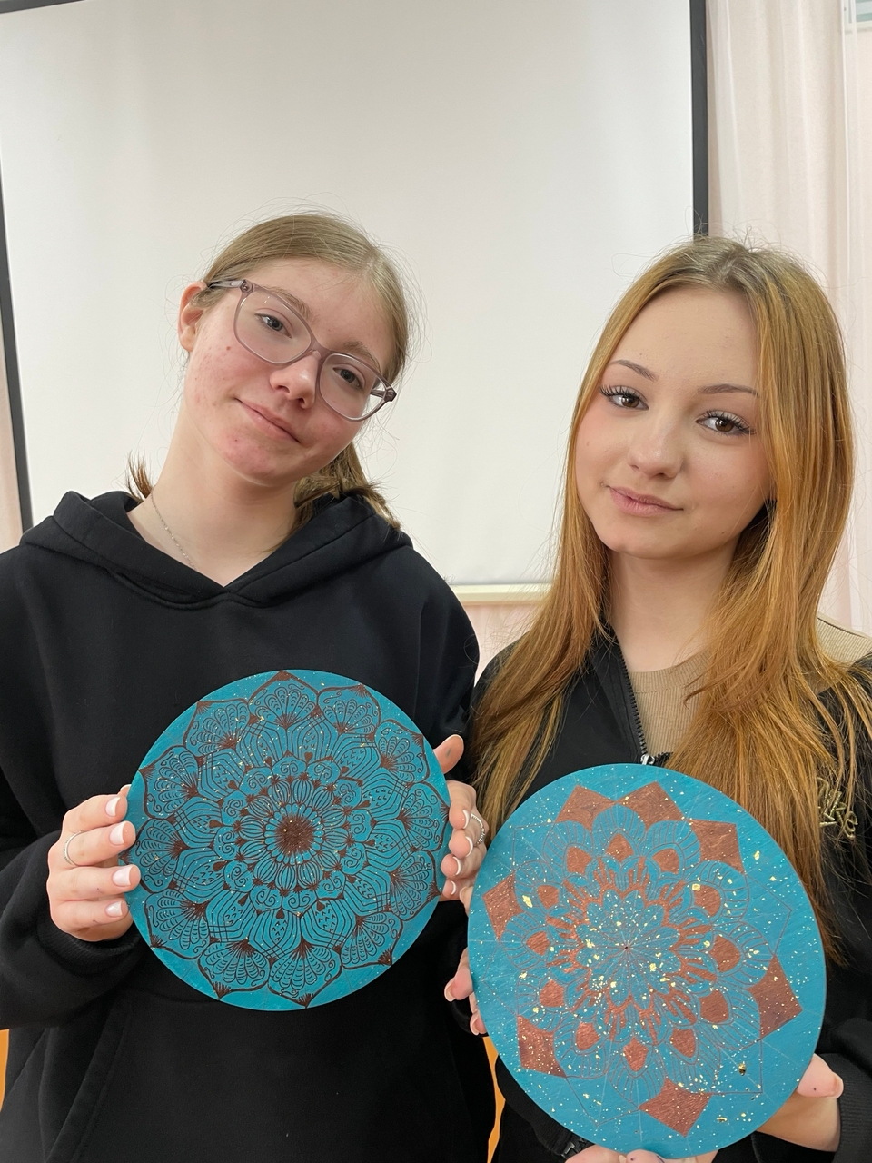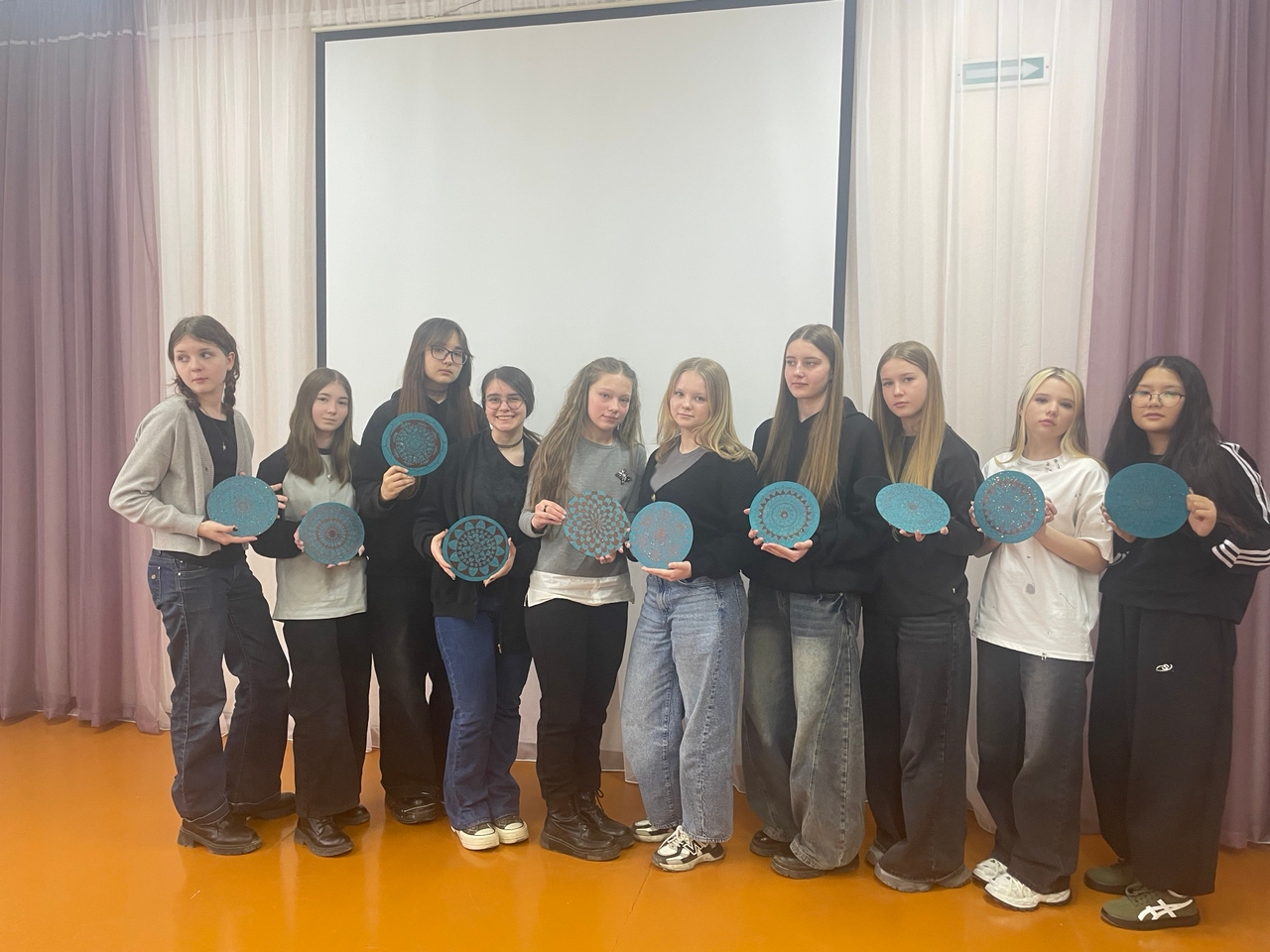 Под звуки волшебной музыки, используя один цвет краски, участницы выразили на деревянном круге свои чувства, эмоции и переживания.