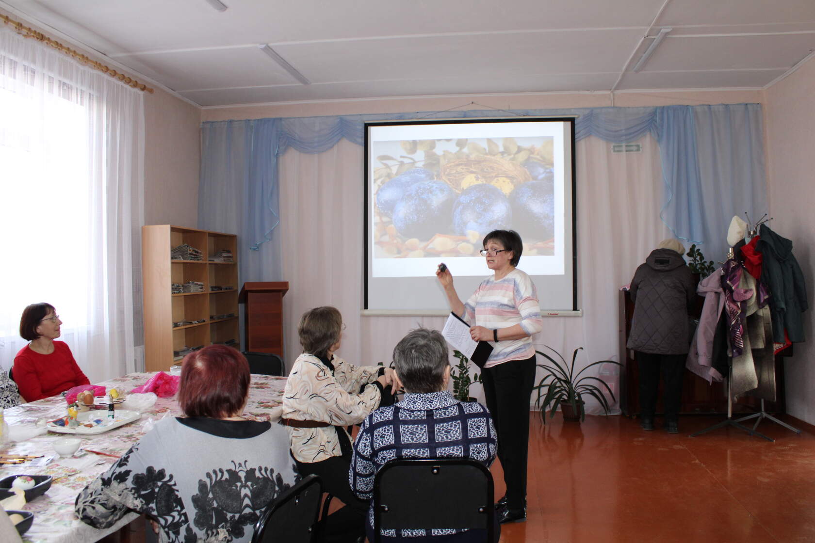 Библиотекарь рассказала об истории, о традиции крашения пасхальных яиц, о различных способах окраски. Рассказ сопровождался наглядной презентацией.
